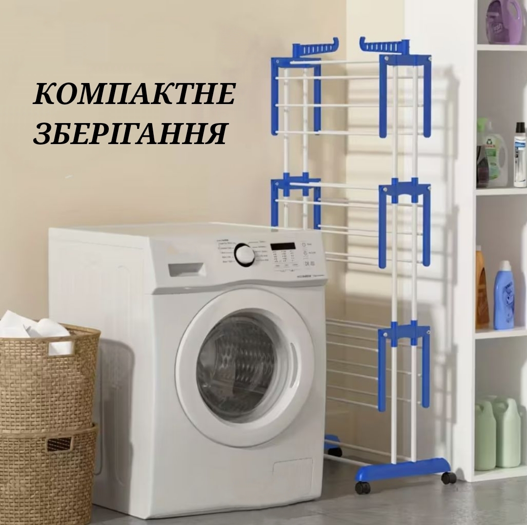 Саме така складна сушарка — це унікальне рішення як для малогабаритних квартир так і для великого будинку і великої родини. Сушарка в складенному положенні займає дуже мало місця. При тому здатна одночасно сушити велику кількість білизни та взуття.